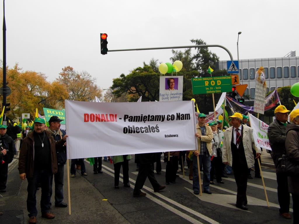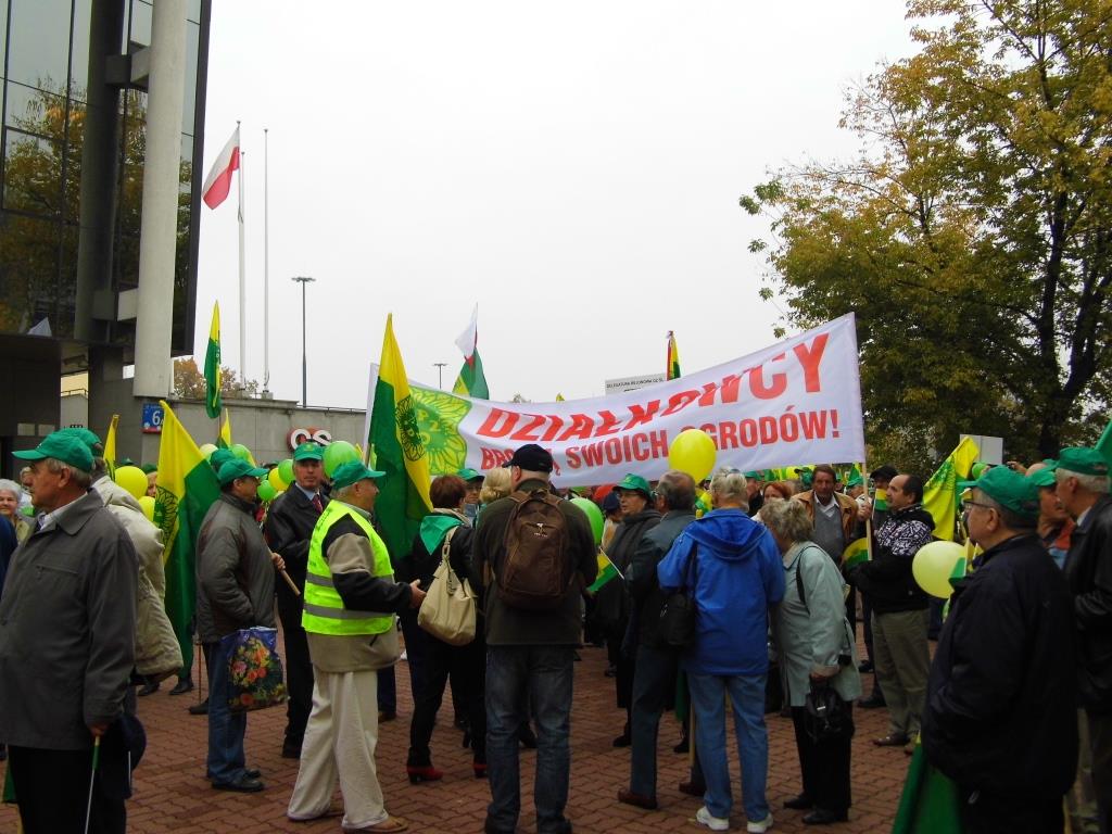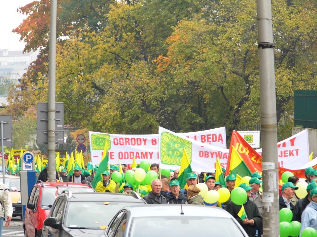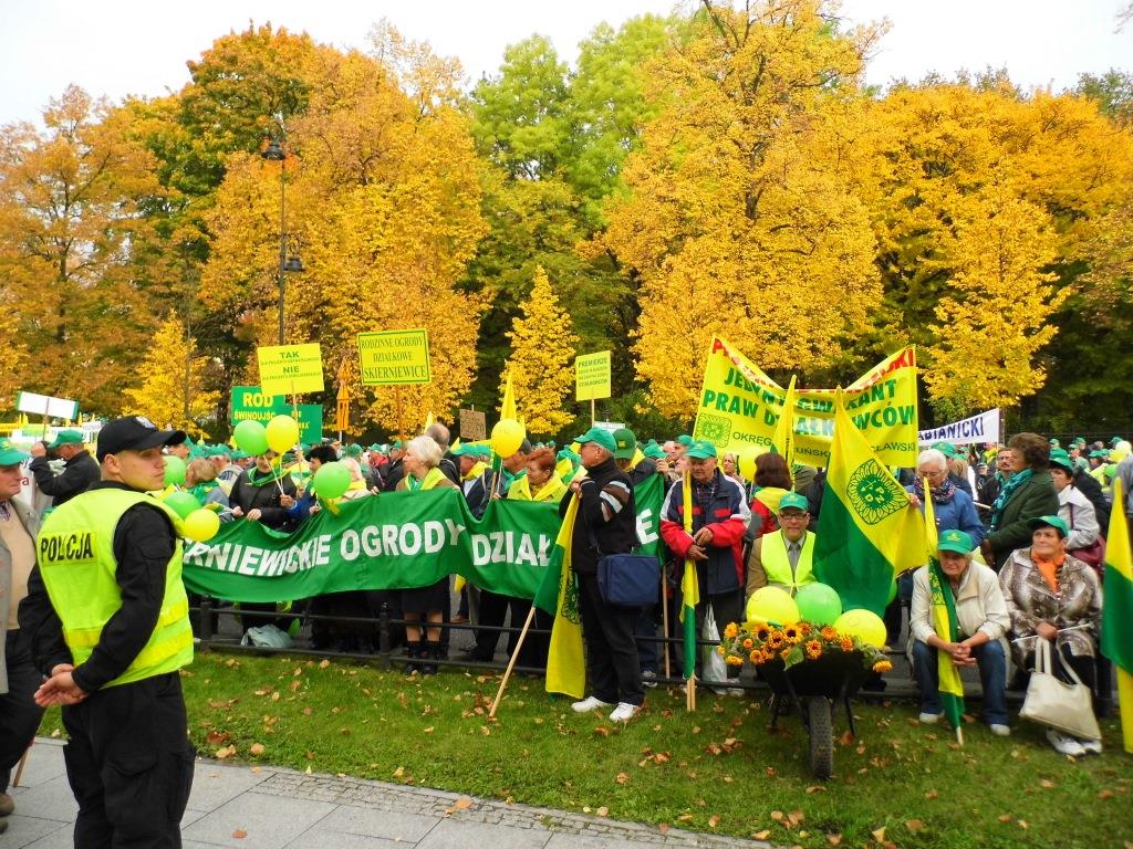 Ponad 15 - tysięcy osób wzięło udział w manifestacji pod Sejmem i Kancelarią Premiera w czwartek (10.10.2013) w Warszawie. Ogólnopolska manifestacja w obronie ROD zgromadziła działkowców z całej Polski, którzy głośno, barwnie i stanowczo pokazali parlamentarzystom, że są zdeterminowani bronić swoich praw do Rodzinnych Ogrodów Działkowych.